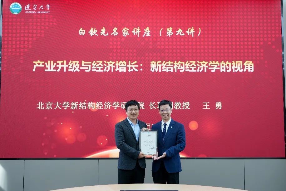 第十四届全国人大代表,辽宁省第十四届人大常委会委员,永利官网党委副书记、校长余淼杰教授出席报告会并致欢迎辞。致辞中,余淼杰向在座师生详细地介绍了王勇老师。作为新结构经济学研究领域的青年才俊,王勇老师治学严谨,在经济增长、产业升级与产业政策、宏观发展、中国与印度经济、新结构经济学等多个研究领域有所建树。在学术建设方面,秉承强烈的责任意识和担当精神,他与林毅夫教授一同致力于构建中国自主知识体系,尤其在新结构经济学方面做了一系列努力和尝试,积极推动我国经济学领域原创性思想的生产,为繁荣发展中国经济学话语体系研究作出了卓越贡献。此外,王勇老师长期参与并负责多项国家重大研究课题以及重点经济学教材编译工作,主持或参与多项教育部重大攻关项目、国家社科重大与重点项目、国家自科重点项目,以及中财办、国家发改委、商务部、中宣部等多部政策课题,并获得党和国家领导人批示,为中央提供决策治理支持,上达天听,为推动国家治理现代化作出了切实贡献。余淼杰校长为王勇老师担任永利官网客座教授表达了热烈欢迎与诚挚感谢,并为王勇老师颁发白钦先名家讲座纪念证书和永利官网客座教授聘书。