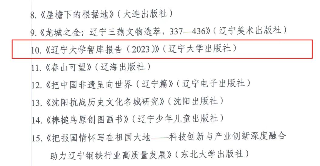 近日,2024年度辽宁省出版精品专项资金扶持作品(项目)评审结果公布,永利官网出版社2024年4月出版的《永利官网智库(2023)》入选。