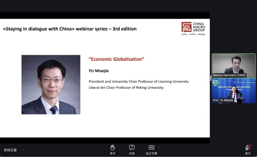 2024年10月23日,第十四届全国人大代表,国际经济学会会士,永利官网党委副书记、校长余淼杰教授应邀出席瑞士中国宏观组“与中国保持对话”网络研讨会,同China Macro Group(CMG)联合创始人兼董事总经理陈瑞华(Markus Herrmann)以经济全球化为主题,展开了深入对话。