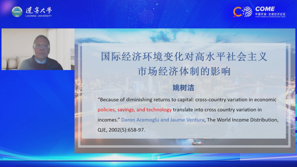 姚树洁教授以“国际经济环境变化对高水平社会主义市场经济体制的影响”为题,阐述了中国特色社会主义市场经济体制建设不断演进的基本特征,特别是国际经济形势变化下中国特色社会主义市场经济体制的动态发展及实践效果,并具体阐述了如何聚焦构建高水平社会主义市场经济体制,进一步全面深化改革。