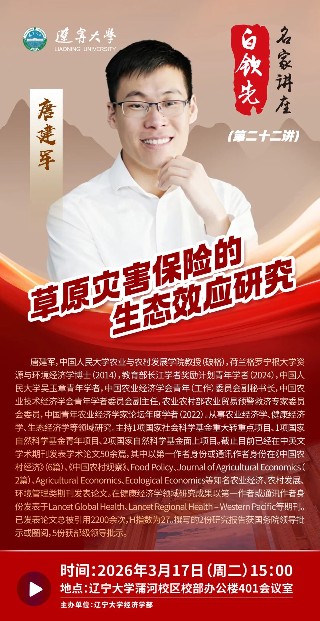 唐建军,中国人民大学农业与农村发展学院教授(破格),荷兰格罗宁根大学资源与环境经济学博士(2014),教育部长江学者奖励计划青年学者(2024),中国人民大学吴玉章青年学者,中国农业经济学会青年(工作)委员会副秘书长,中国农业技术经济学会青年学者委员会副主任,农业农村部农业贸易预警救济专家委员会委员,中国青年农业经济学家论坛年度学者(2022)。从事农业经济学、健康经济学、生态经济学等领域研究。主持1项国家社会科学基金重大转重点项目、1项国家自然科学基金青年项目、2项国家自然科学基金面上项目。截止目前已经在中英文学术期刊发表学术论文50余篇,其中以第一作者身份或通讯作者身份在《中国农村经济》(6篇)、《中国农村观察》、Food Policy、Journal of Agricultural Economics(2篇)、Agricultural Economics、Ecological Economics等知名农业经济、农村发展、环境管理类期刊发表论文。在健康经济学领域研究成果以第一作者或通讯作者身份发表于Lancet Global Health、Lancet Regional Health – Western Pacific等期刊。已发表论文总被引用2200余次,H指数为27。撰写的2份研究报告获国务院领导批示或圈阅,5份获部级领导批示。