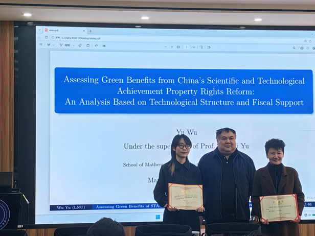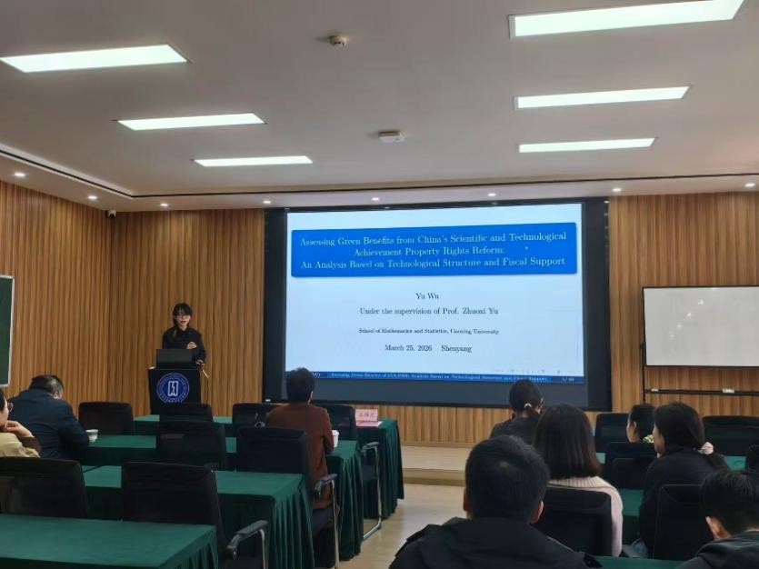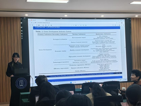 数学与统计学院应用统计学博士研究生武宇应邀作了题为《评估中国科技成果产权改革的绿色效益:基于技术结构和财政支持的分析》的学术报告。她指出,科技成果产权改革(STA-PRR)直接作用于科技成果的产出与转化,进而影响城市绿色转型进程。她利用中国城市的面板数据,通过估计对数化的科技成果生产函数识别各个样本城市的科研人员产出弹性,并依据这一弹性划分改革的处理组。这种分组策略为STA-PRR,这一非试点政策的影响评估提供了一种可迁移的方法,可扩展到更广泛的政策环境。通过研究发现:(1)STA-PRR能有效促进城市绿色发展,该结论通过了基于合成双重差分(SDID)、广义合成控制(GSC)等稳健方法的检验。(2)机制研究表明,STA-PRR通过改善城市技术结构,即激发技术比较优势的同时促进城市之间的技术互补,提升城市绿色发展水平。(3)STA-PRR能与财政政策工具形成协同作用,激发不同种类财政科研支出的绿色效益。具体而言,STA-PRR对应用研究支出的激发作用大于对基础研究支出的激发作用。(4)经过地方政府加码的改革仍能带来绿色效益,但强化改革带来的边际绿色收益递减。(5)异质性分析指出,改革在不同的城市科研环境、资源禀赋、经济水平下对城市绿色发展影响不同。
