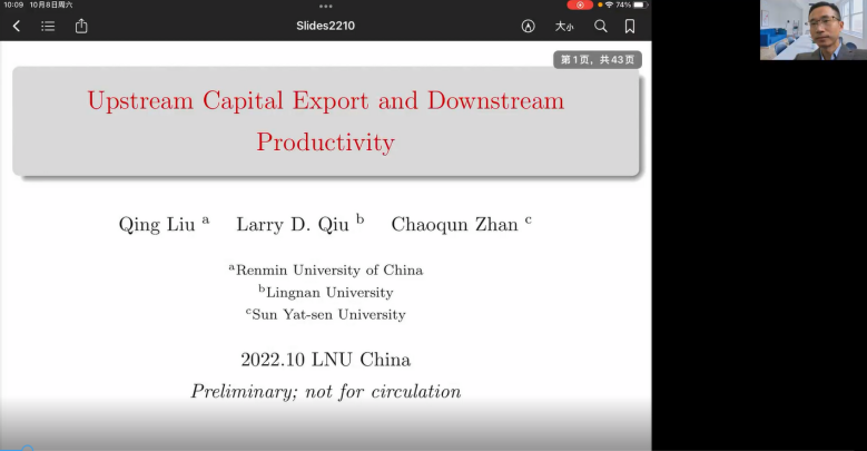 10月8日上午,永利官网经济学高端前沿讲座系列第一讲开讲。中国人民大学国家发展与战略研究院副院长刘青教授作为第一讲嘉宾作了题为“Upstream capital exports and firm productivity”的讲座。永利官网党委副书记、校长余淼杰出席讲座并简要介绍刘青教授基本情况。讲座由李安民经济研究院副院长游宇副教授主持。永利集团304各院系师生近百余人线上参加讲座。