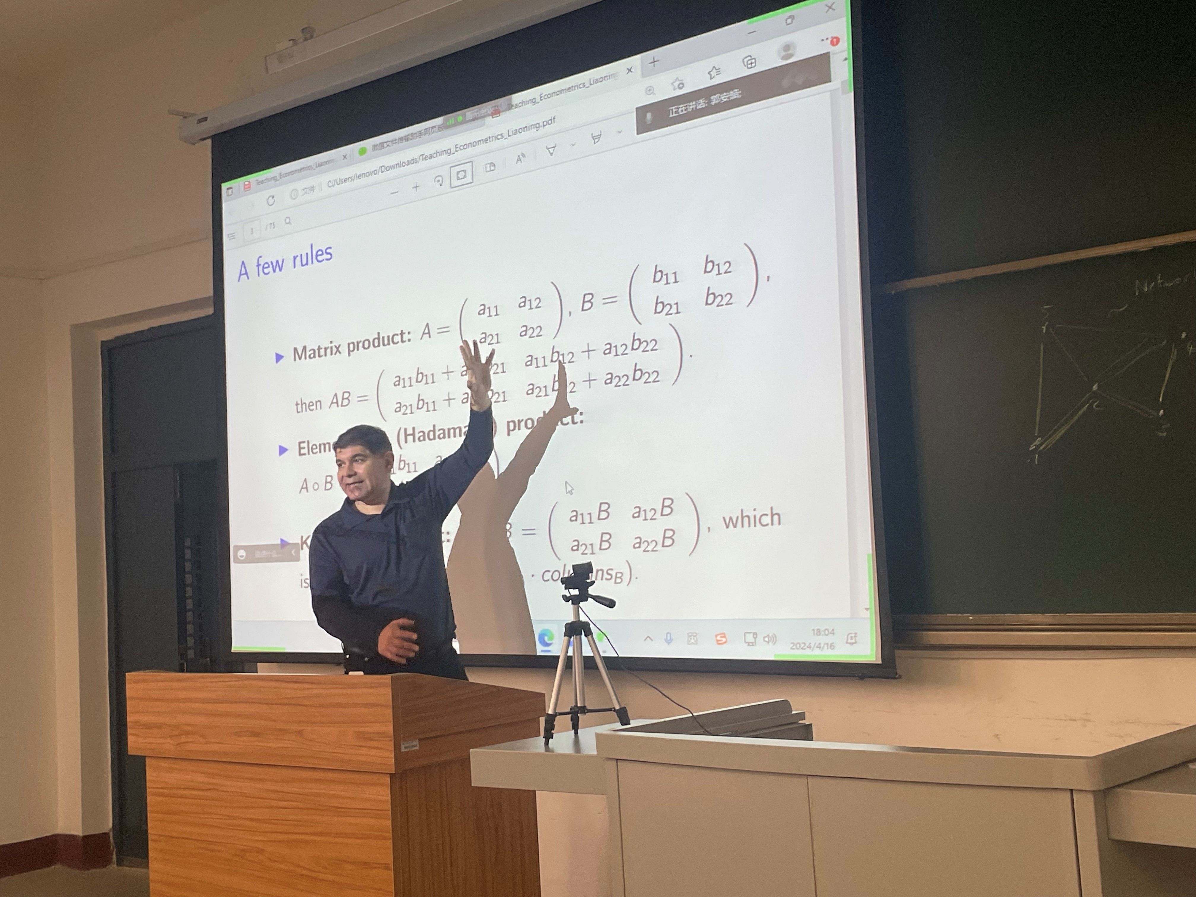 课堂上,艾格教授生动解析了横截面数据的核心内涵及独特属性,系统阐述了横截面数据的基础理论框架,深度探讨了普通最小二乘法(Ordinary Least Squares, OLS)、两阶段最小二乘法(Two-Stage Least Squares, 2SLS)以及广义矩估计(Generalized Method of Moments, GMM)这三种重要估计方法。艾格教授逐一剖析了三种估计方法的优势、局限性及适用条件,并通过严谨论证和实例演示,引导同学们深入分析了每种估计方法的背后逻辑和应用场景。整个讲解过程逻辑缜密、内容详实,激发学生对数据分析的浓厚兴趣,引导学生对计量分析进行更为深入思考与学习。150余名学生在崇山校区和蒲河校区选修或旁听此门课程。