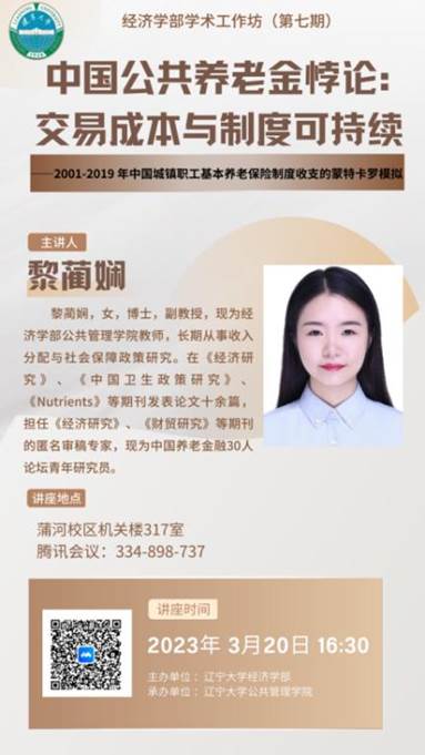 黎蔺娴,女,博士,副教授,现为永利集团304公共管理学院教师,长期从事收入分配与社会保障政策研究。在《经济研究》《中国卫生政策研究》《Nutrients》等期刊发表论文十余篇,担任《经济研究》《财贸研究》等期刊的匿名审稿专家,现为中国养老金融30人论坛青年研究员。