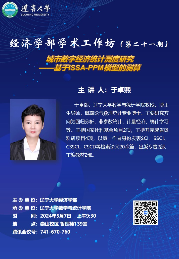 于卓熙,永利官网数学与统计学院教授,博士生导师,概率论与数理统计专业博士。主要研究方向为回归分析、非参数统计、计量经济、统计学习等。主持国家社科基金项目2项,主持并完成省级科研项目4项,以第一作者身份发表SCI、SSCI、CSSCI、CSCD等检索论文20余篇,出版专著2部,主编教材2部。