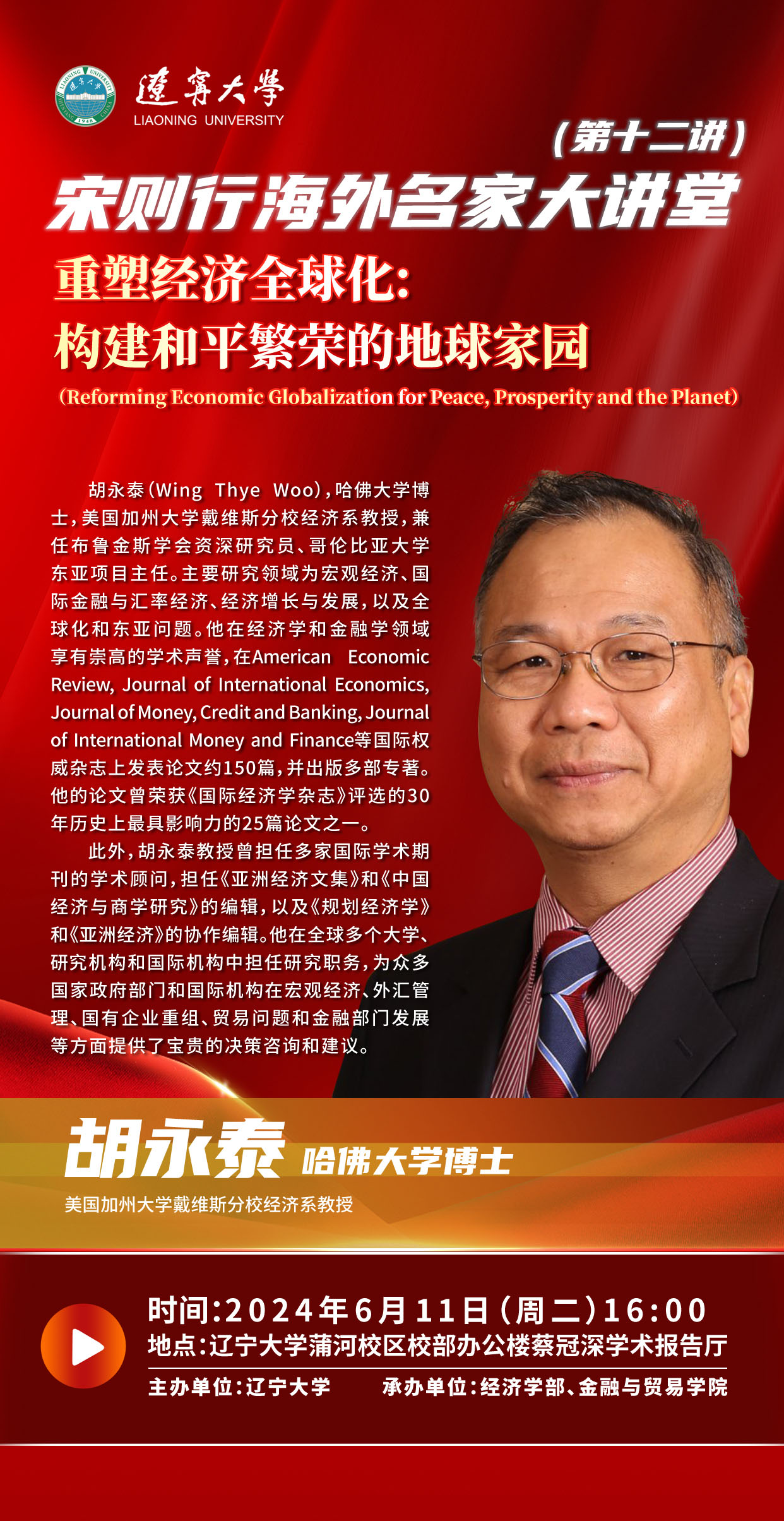 胡永泰(Wing Thye Woo),哈佛大学博士,美国加州大学戴维斯分校经济系教授,兼任布鲁金斯学会资深研究员、哥伦比亚大学东亚项目主任。主要研究领域为宏观经济、国际金融与汇率经济、经济增长与发展,以及全球化和东亚问题。他在经济学和金融学领域享有崇高的学术声誉,在American Economic Review, Journal of International Economics, Journal of Money, Credit and Banking, Journal of International Money and Finance等国际权威杂志上发表论文约150篇,并出版多部专著。他的论文曾荣获《国际经济学杂志》评选的30年历史上最具影响力的25篇论文之一。