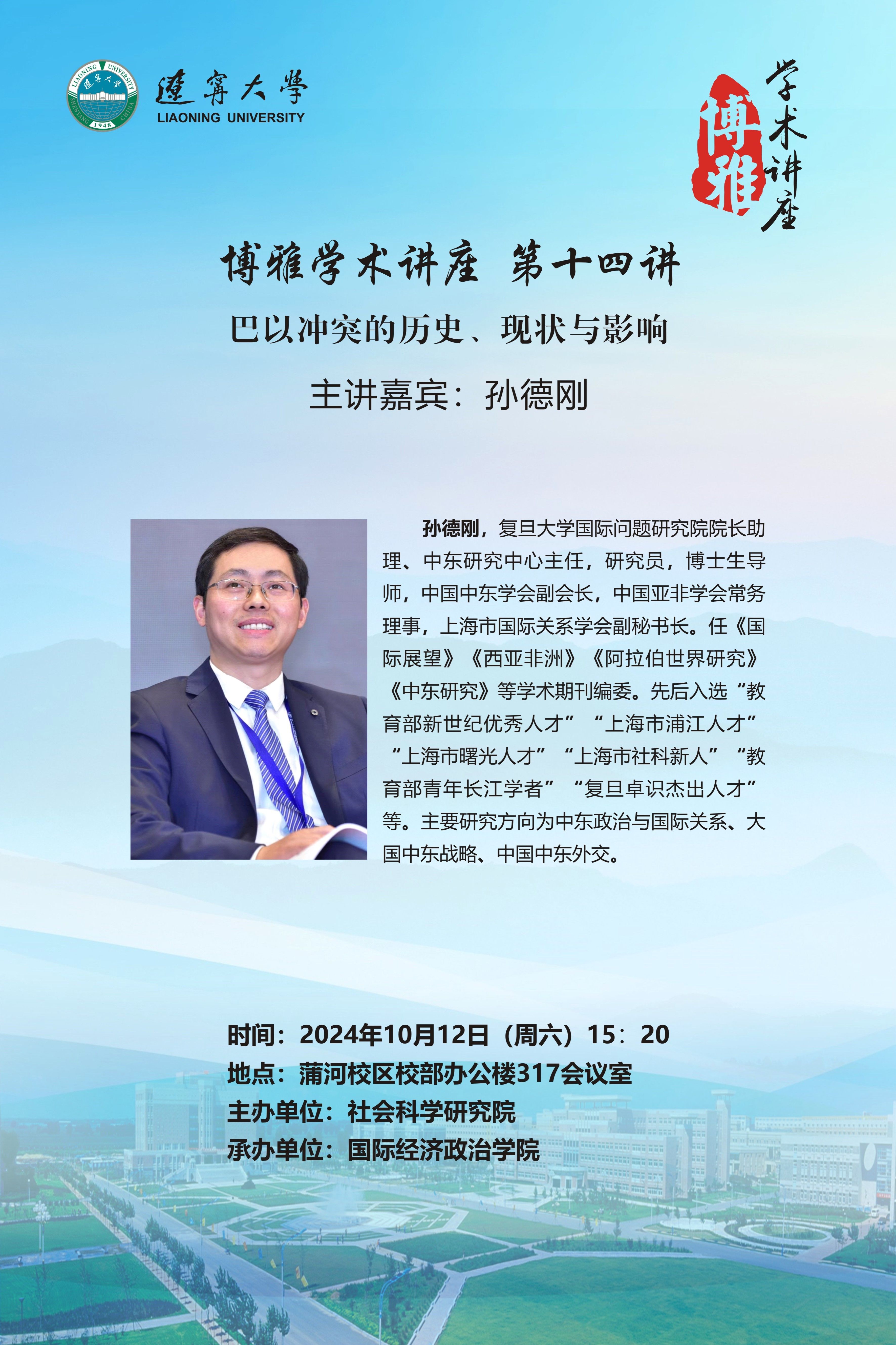 为持续建设高端学术交流平台,拓宽广大师生学术视野,学校瞄准科学发展前沿,同国际接轨,学校开设“博雅学术讲座”,邀请国内外知名学者来校开展专题讲座。博雅学术讲座第十四讲将于10月12日(周六)15:20开讲,并邀请到了复旦大学孙德刚教授作为主讲嘉宾,为师生们带来题为“巴以冲突的历史、现状与影响”的学术讲座。