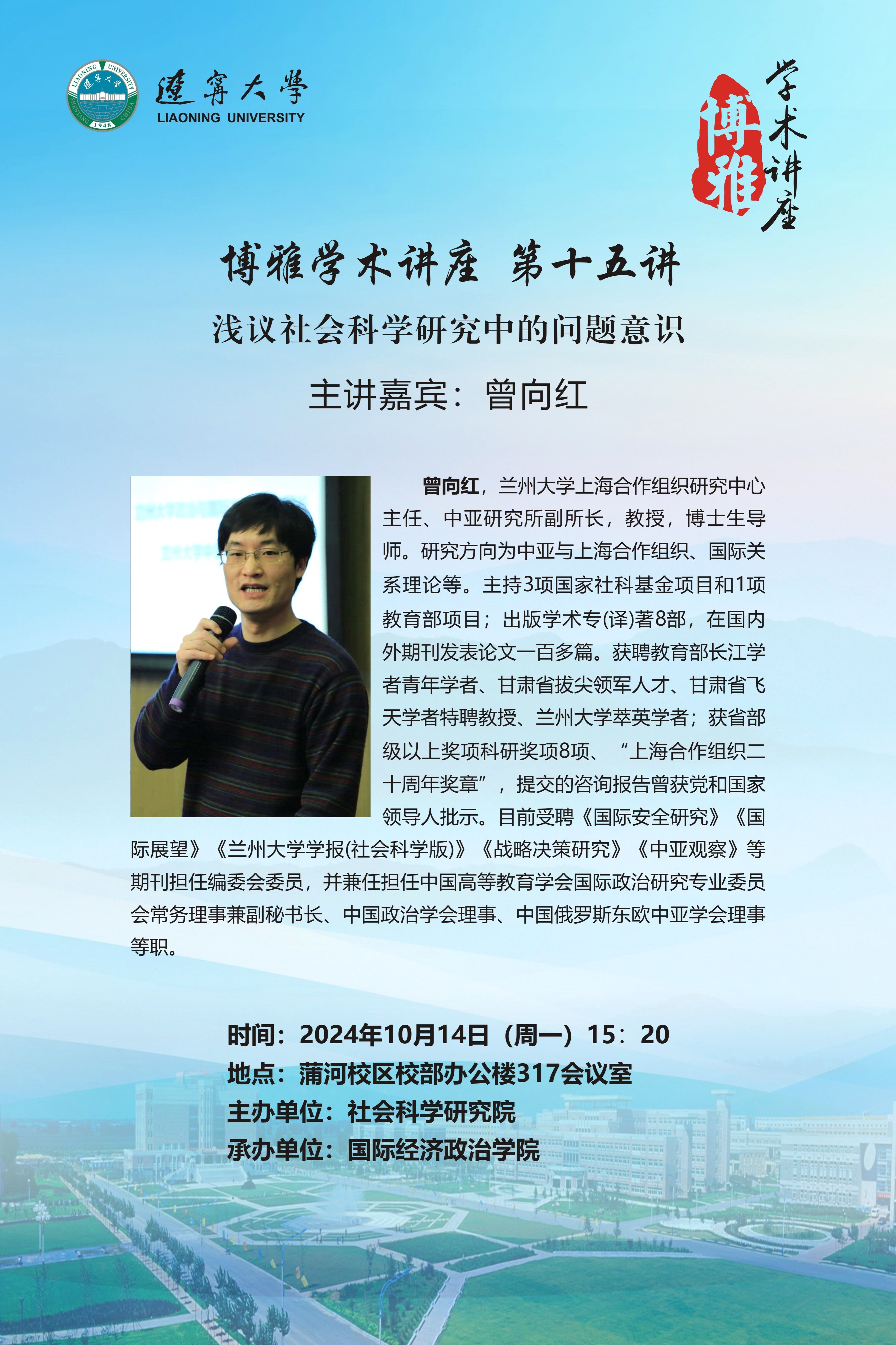为持续建设高端学术交流平台,拓宽广大师生学术视野,学校瞄准科学发展前沿,同国际接轨,学校开设“博雅学术讲座”,邀请国内外知名学者来校开展专题讲座。博雅学术讲座第十五讲将于10月14日(周一)15:20开讲,并邀请到了兰州大学曾向红教授作为主讲嘉宾,为师生们带来题为“浅议社会科学研究中的问题意识”的学术讲座。