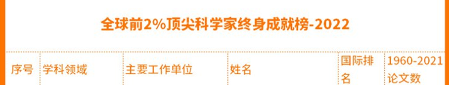 “World’s Top 2% Scientists” selects top 2% scientists from approximately seven million scientists worldwide. The list includes two separate data for career-long impact and single-year impact. Scientists are classified into 22 scientific fields and 176 sub-fields. The list, compiled by the team of Prof. John P.A. Ioannidis of Stanford University, was first released on Mendeley Data in June, 2019. The list of 2022 is the fourth edition. 200,409 scientists were selected to be included in the database, among which 7795 scientists has been admitted to the Career-Long Impact list of World’s Top 2% Scientists. The list uses data provided by Elsevier Scopus, is based on standardized information on citations, h-index, co-authorship adjusted hm-index, citations to papers in different authorship positions and a composite indicator (c-score). All indicators are used to make comprehensive evaluations on scientists’ research status and long-term research performance, through which scientists’ academic impact are reflected in a true and objective way. Being admitted to the list not only shows that these scientists are at the forefront of their research fields and that their research achievements have been widely recognized, but it also demonstrates the strong scientific research capability of the institutions where they work.
