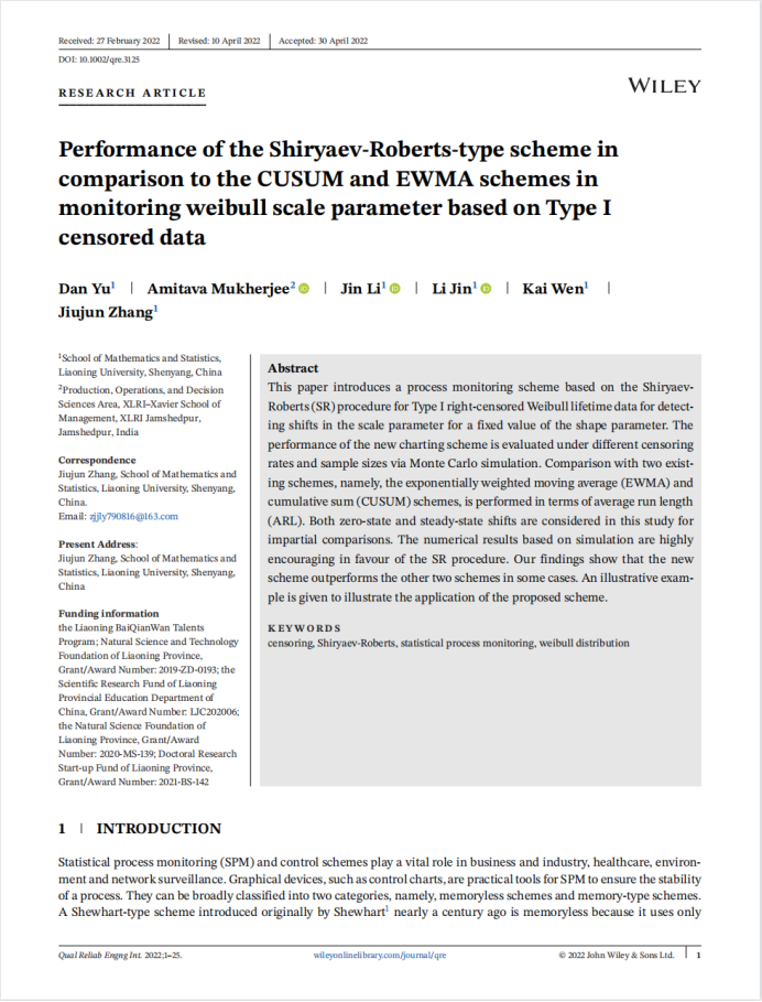 本文提出了一种基于ShiryaevRoberts 检验方法用于检测带有I类右删失的Weibull分布尺度参数控制图。论文通过蒙特卡罗模拟方法衡量了控制图在不同删失率与不同样本容量下的性能表现。通过使用零状态与平稳状态下的平均运行长度指标与已有的指数加权移动平均(EWMA)控制图及累积和(CUSUM)控制图进行比较。模拟结果表明,我们提出的新方法在多数情况下都优于已有的两种方法。论文通过一个实例来说明本文提出的新方法在实际中的有效性。