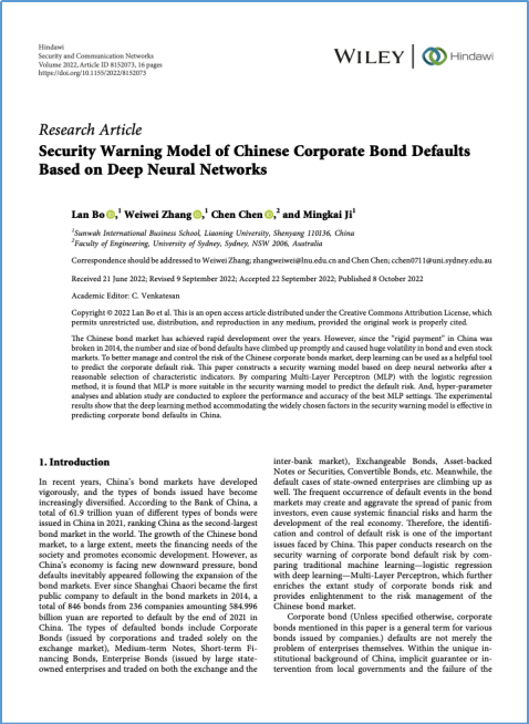 新华国际商学院薄澜副教授(第一作者)和张微微副教授(通讯作者)于2022年10月在国际期刊Security and Communication Networks在线发表题为Security Warning Model of Chinese Corporate Bond Defaults Based on Deep Neural Networks的学术论文。悉尼大学工程学院博士生陈晨(原新华国际商学院2012级学生)和新华国际商学院2019级本科生季铭凯参与论文写作。