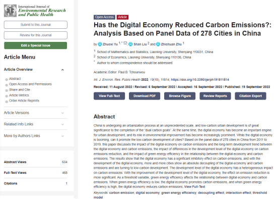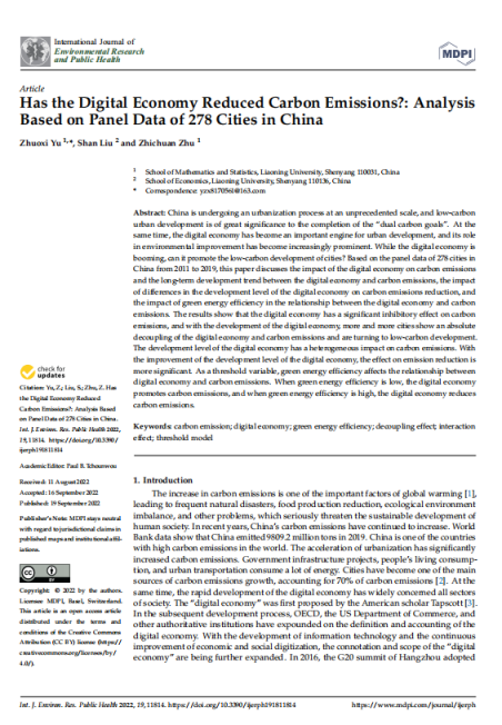 数学与统计学院于卓熙教授2022年9月在International Journal of Environmental Research and Public Health发表题为“Has the Digital Economy Reduced Carbon Emissions?: Analysis Based on Panel Data of 278 Cities in China”的学术论文。经济学院博士研究生刘珊、数学与统计学院祝志川教授参与论文写作。