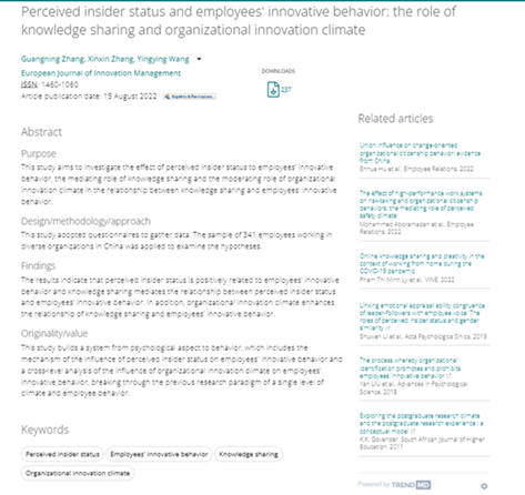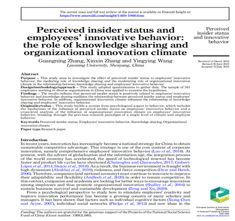 商学院张广宁教授作为第一作者与硕士研究生合作完成的论文“Perceived insider status and employees’innovative behavior: the role of knowledge sharing and organizational innovation climate” 在《European Journal of Innovation Management》发表。