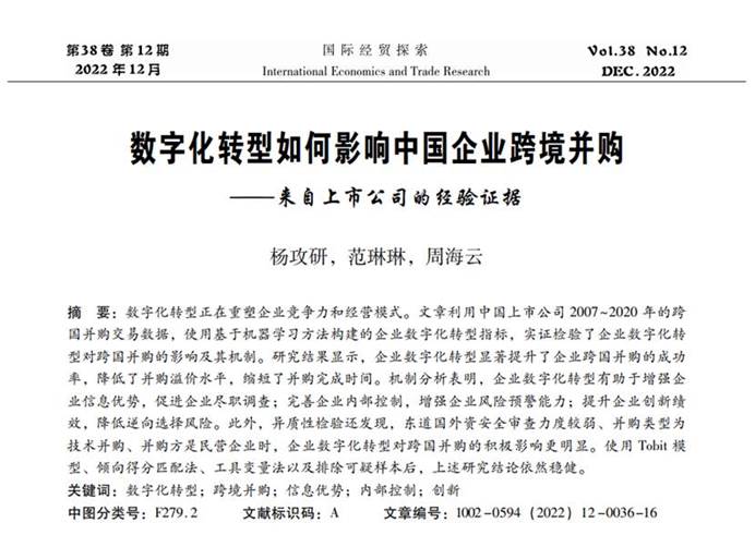 国际经济政治学院杨攻研教授(第一作者)与两位合作者共同完成的学术论文“数字化转型如何影响中国企业跨境并购——来自上市公司的经验证据”,在《国际经贸探索》2022年第12期发表。