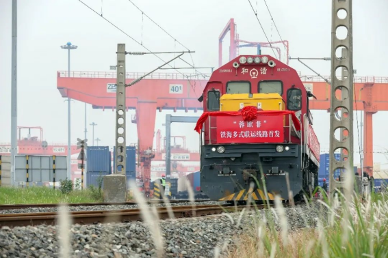2022年10月15日,在党的二十大召开的前一天,载满货物的“蓉欧非”铁海多式联运首班列车从四川成都青白江发车。“蓉欧非”线路联通成都、欧洲与非洲,货物搭乘中欧班列(成都)运输至德国汉堡,再经汉堡港海运至非洲摩洛哥卡萨布兰卡港,全程运输时效35天。